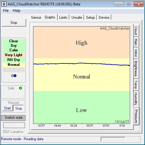 Through an infrared sensor of the AAG CloudWatcher measures the temperature of the sky, and an electronic thermometer measures the internal temperature. Both data are then related by a powerful formula used to determine the existence of clouds. The measuring result is easily read on the graphic “Cloud”.