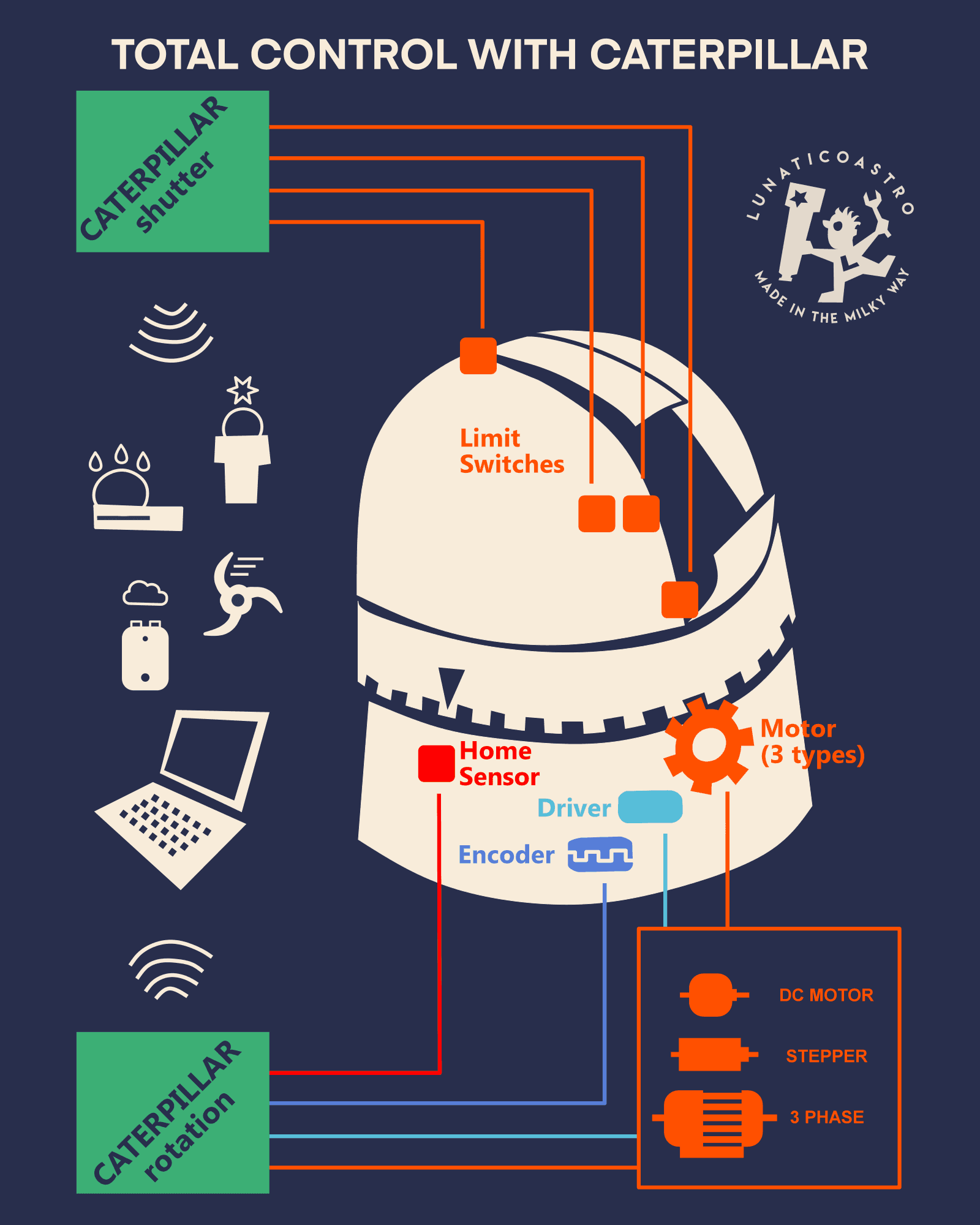 The CaterpillarR is designed to upgrade existing observatories with manual operation, allowing control via four switches.