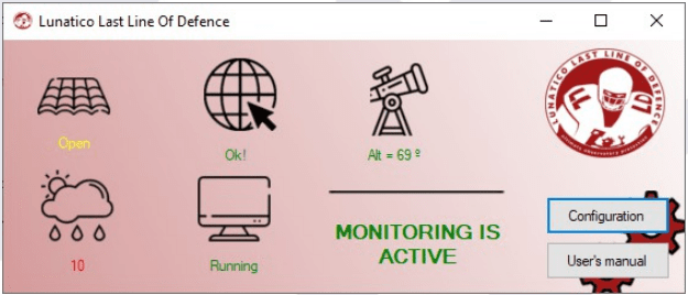 Lunatico Last Line of Defence is, as its name implies, the last element in the safety of your observatory. In a nutshell, it will monitor certain elements, periodically, and take control of and close the observatory if the circumstances become unsafe. The software is distributed in a new fashion we like to call “Up To You Ware“. It does not need any additional Lunatico product – although it is a great partner to our Good Night System.